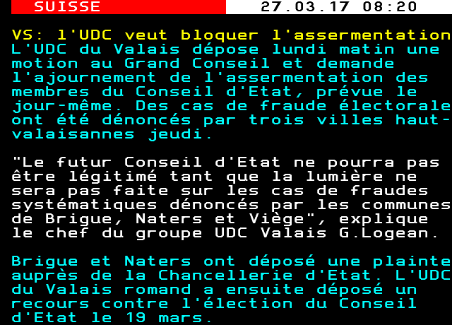 Brigue et Naters ont déposé une plainte, respectivement mercredi et vendredi, auprès de la Chancellerie d'Etat. L'UDC du Valais romand a ensuite déposé un recours contre l'élection du Conseil d'Etat le 19 mars.