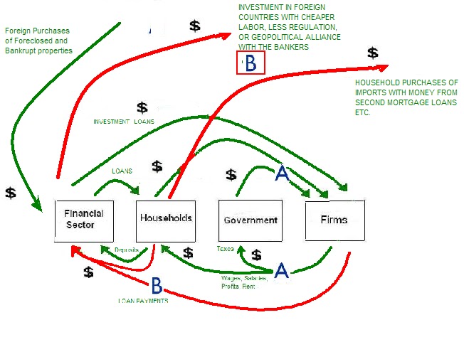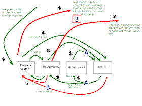 Remember this too: The prices we pay for objects include 40 percent of interest payments. Those are prices going to the financial sector which is not recirculating them back into the economy -- those dollars paid in the price of goods that do not go to the producing firm but go to finance are dollars that will not be calling forth more production. More than three quarters of our tax money goes to fund both interest payments on the national debt and the military that maintains a world empire and, currently two major wars/occupations. The wars themselves are a form of "export" (exporting destruction) that is make-work for US corporations.