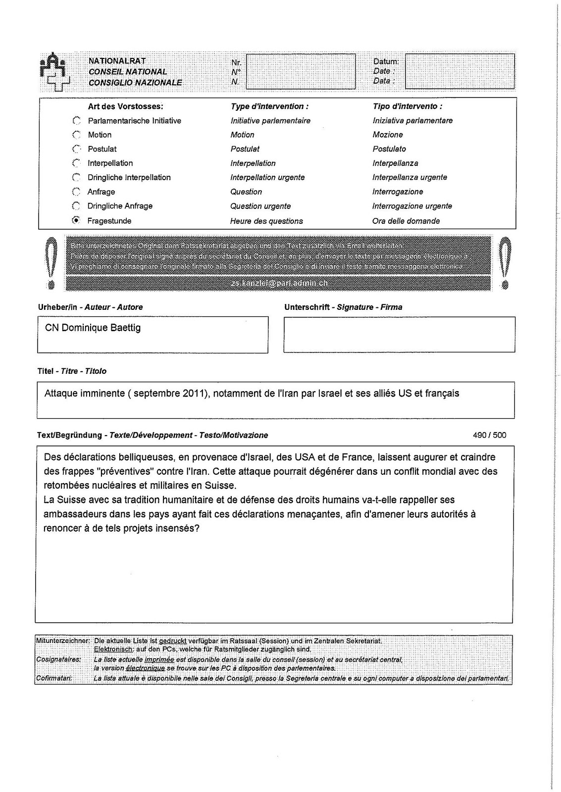 Posted on14 September 2011. Tags: 2011, Author National Counselor Dominique Baettig, Date September, Dominique Baettig, France, human rights, IRAN, ISRAEL, military, rights, Swiss Legislator, Switzerland, Text Development, US, USA, World, World War
