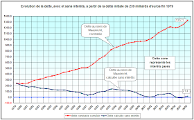 C'est ainsi que dans notre pays, de début 1995 à fin 2011 la dette a augmenté de 1150 milliards d'euros. Pendant ce temps nous avons payé (et donc dû emprunter), au seul titre de l'intérêt, plus de 815 milliards d'euros.