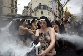 - Les jeunes filles en questions appartiennent au groupe les FEMEN d’origine ukrainienne, groupe interdit en Ukraine, financé par un milliardaire allemand ; elles sont venues contre-manifester illégalement puisque sans déclaration préalable, avec virulence, en portant un voile de religieuse sur la tête, les seins nus, certaines en porte-jarretelles, avec des expressions injurieuses écrites sur la poitrine (« fuck God », « fuck church », « Saint-esprit étroit », « Marie marions-nous », « occupe-toi de ton cul »), pour attaquer les manifestants de CIVITAS -dont des enfants qui ont été extrêmement choqués- en les aspergeant de gazs fumigènes contenus dans des aérosols mentionnant en Anglais « Saint sperme » et « sperme de Jésus » ! Une photo en témoigne : un enfant dans sa poussette a été directement visé par un jet de gaz de l’une des FEMEN !
