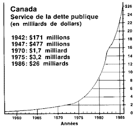 Dans son rapport de novembre 1993, le vérificateur général du Canada disait que sur la dette nette de 423 milliards $ accumulée par le gouvernement canadien de 1867 à 1992, seulement 37 milliards $ avaient été dépensés pour des biens et services, alors que le reste (386 milliards $, ou 91% de la dette) consistait en frais d'intérêt, ce qu'il a coûté au gouvernement pour emprunter ce 37 milliards $ (c'est comme si le gouvernement avait emprunté ce 37 milliards $ à un taux de 1043%! ). En novembre 1995, une étude du Mouvement Desjardins arrivait à la même conclusion: sur la dette fédérale de 543 milliards $ en date du 31 mars 1995, 487 milliards $ (ou 90%) sont le résultat d'intérêts composés. En d'autres mots, le capital dépensé pour des biens et services a déjà été remboursé plus de dix fois!