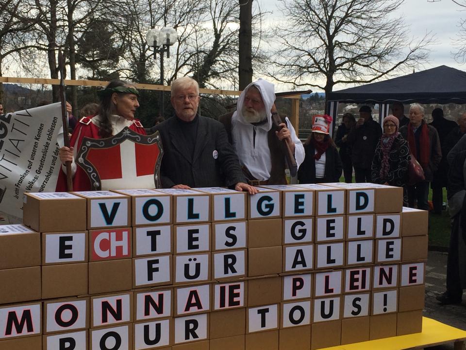 Zwei Symbolfiguren für ein neues Geldsystem: Helvetia und Tell unterschreiben auf dem Bundesplatz die Vollgeld-Initiative. (Bild: Keystone).