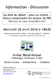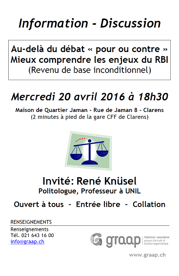 Le 5 juin, nous allons voter pour ou contre l’initiative sur le Revenu de Base inconditionnel. Pour mieux comprendre les enjeux, Le Graap vous invite à une conférence/débat suivie d’un apéritif :