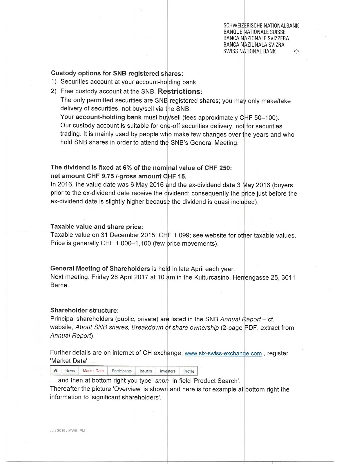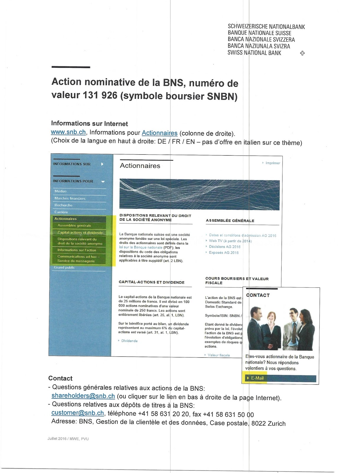 Pour toute question, les actionnaires peuvent s'adresser à: shareholders@snb.ch