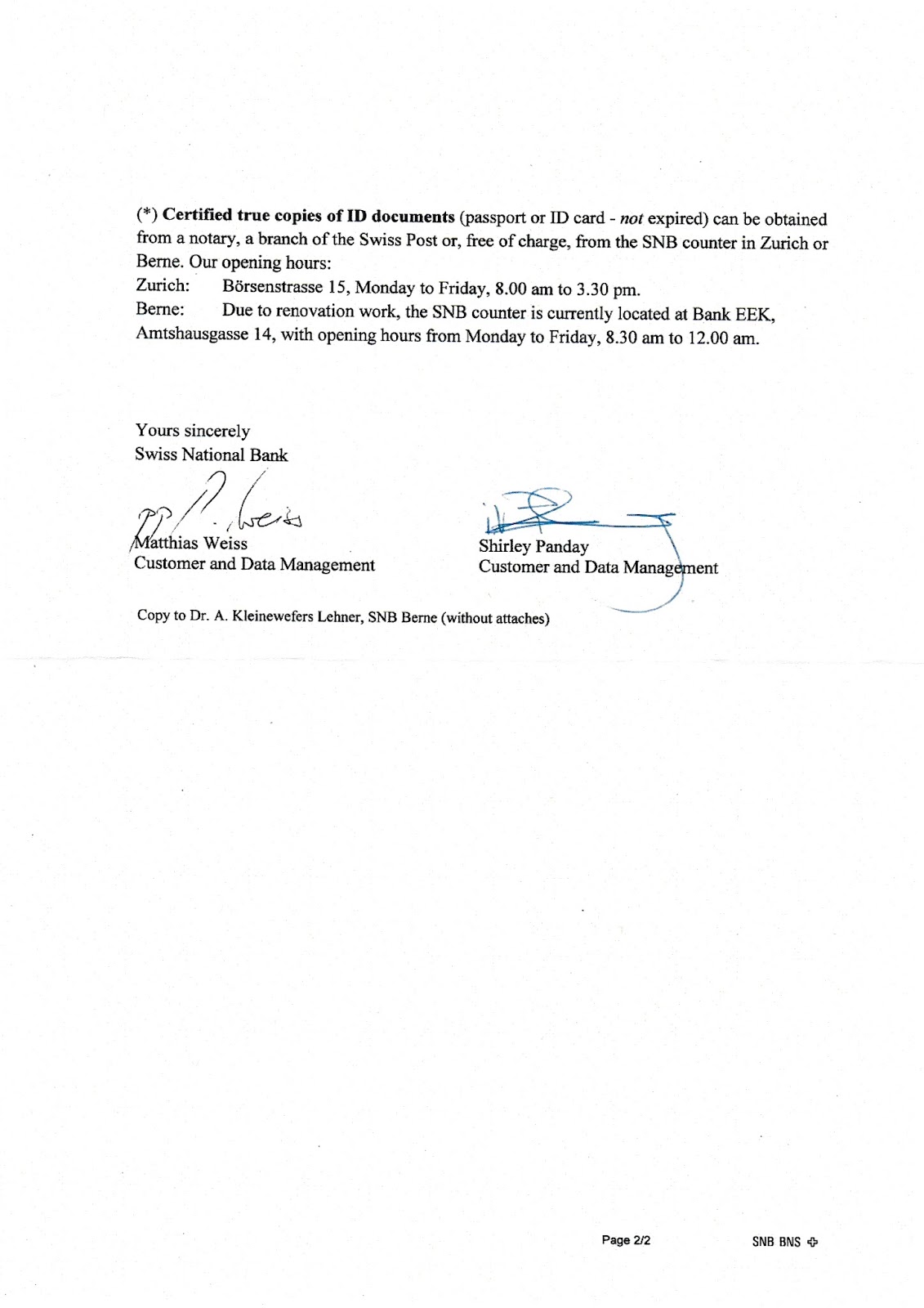 Une grande partie de la correspondance avec la Banque Nationale Suisse a lieu en anglais, alors que nous avons trois langues nationales... Pourquoi ? ( voir quelques exemples en bas de ce document, qui démontrent aussi un esprit mesquin d’excès de formalisme anglo-saxon et pas du tout suisse... ). On peut remarquer les heures d'ouverture de 8h30 à 12h00, sic, rien en Suisse romande...