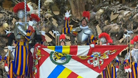 Les suisses lèvent la main droite, 3 doigts dressés en l'honneur de la Sainte Trinité, et deux doigts pliés en l'honneur des deux natures du Christ, divine et humaine.