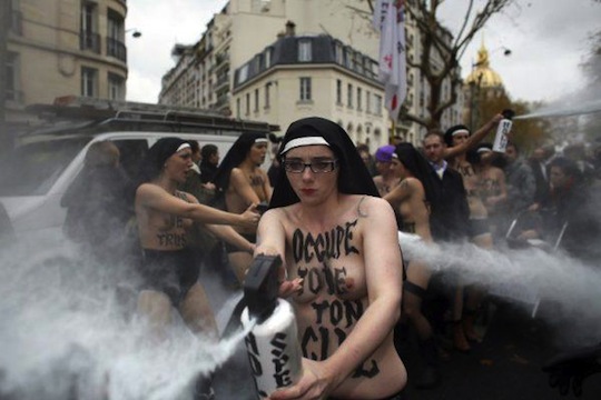 - Les jeunes filles en questions appartiennent au groupe les FEMEN d’origine ukrainienne, groupe interdit en Ukraine, financé par un milliardaire allemand ; elles sont venues contre-manifester illégalement puisque sans déclaration préalable, avec virulence, en portant un voile de religieuse sur la tête, les seins nus, certaines en porte-jarretelles, avec des expressions injurieuses écrites sur la poitrine (« fuck God », « fuck church », « Saint-esprit étroit », « Marie marions-nous », « occupe-toi de ton cul »), pour attaquer les manifestants de CIVITAS -dont des enfants qui ont été extrêmement choqués- en les aspergeant de gazs fumigènes contenus dans des aérosols mentionnant en Anglais « Saint sperme » et « sperme de Jésus » ! Une photo en témoigne : un enfant dans sa poussette a été directement visé par un jet de gaz de l’une des FEMEN !
